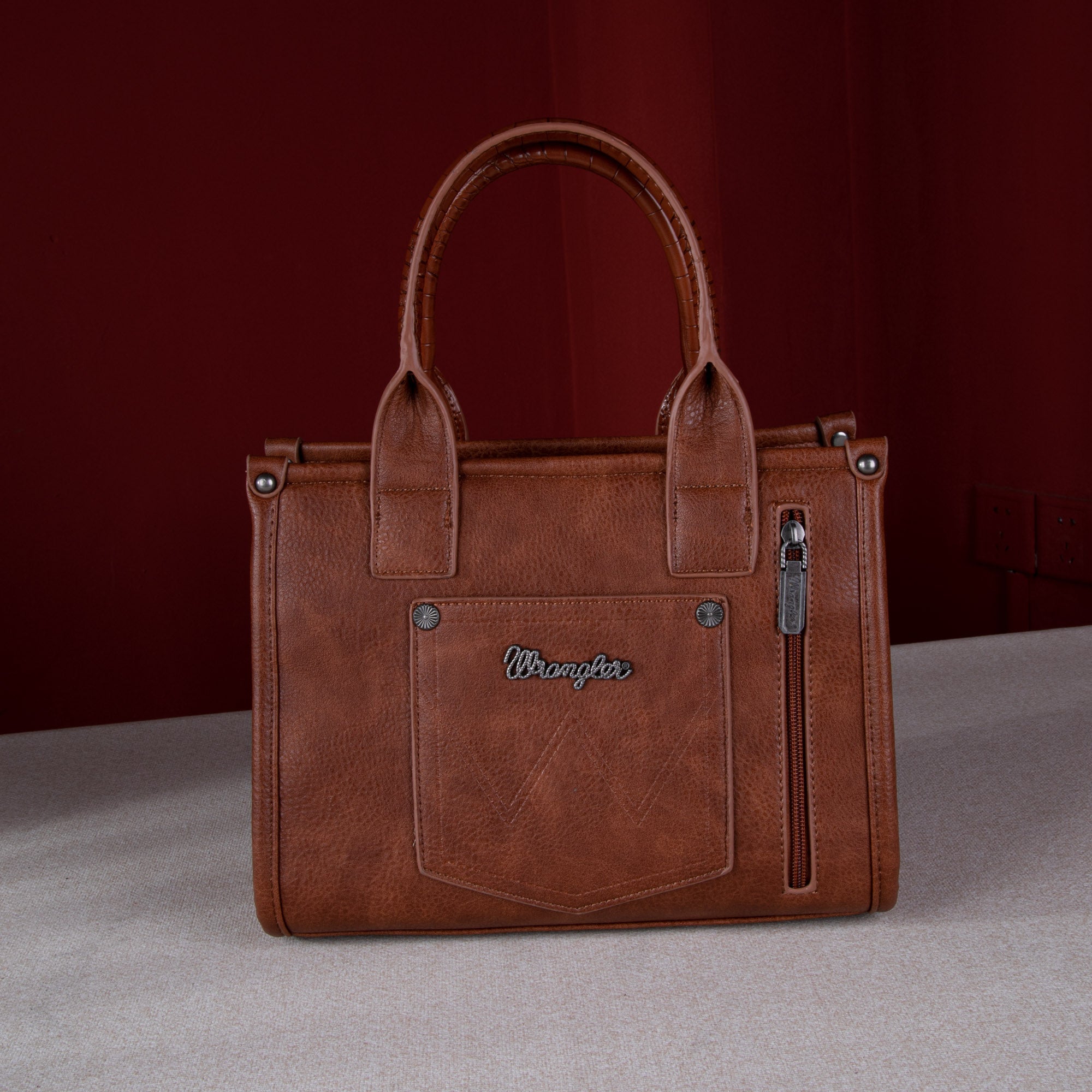 High quality synthetic Croc Print along base of tote, with Croc Print on Handles on canvas. Featuring a whipstitch detail on the front, wrangler logo applique on the front with a top sipper closure and double round handle. The inside of the tote includes a zippered pocket and 2 open pockets.