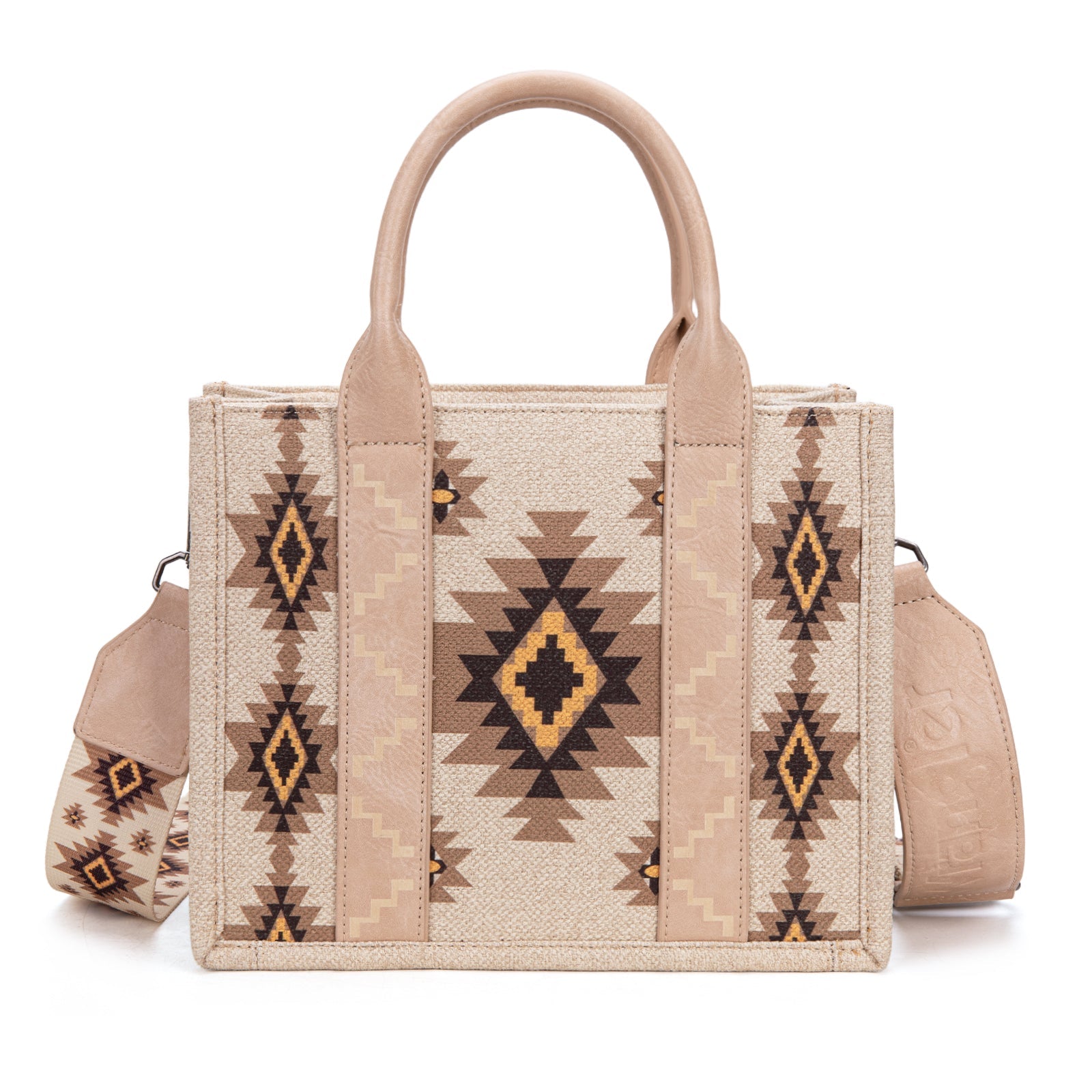 The Wrangler Crossbody Tote features a bold Aztec Retro print, and whipstitching giving it a unique, eye-catching look. It is the perfect accessory to elevate any outfit while offering both style and functionality.